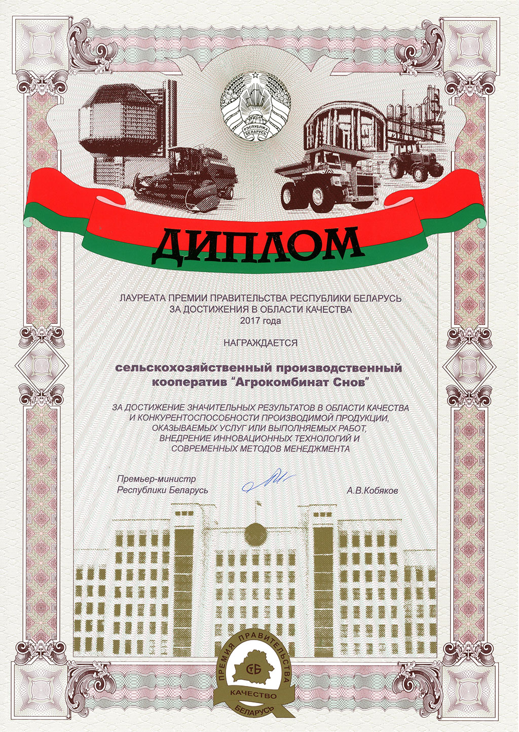 СПК «Агрокомбинат Снов» - дважды лауреат Премии правительства за достижения в области качества.