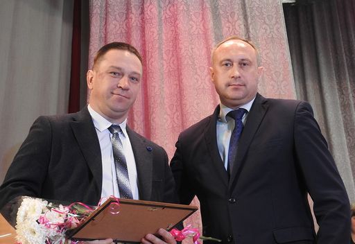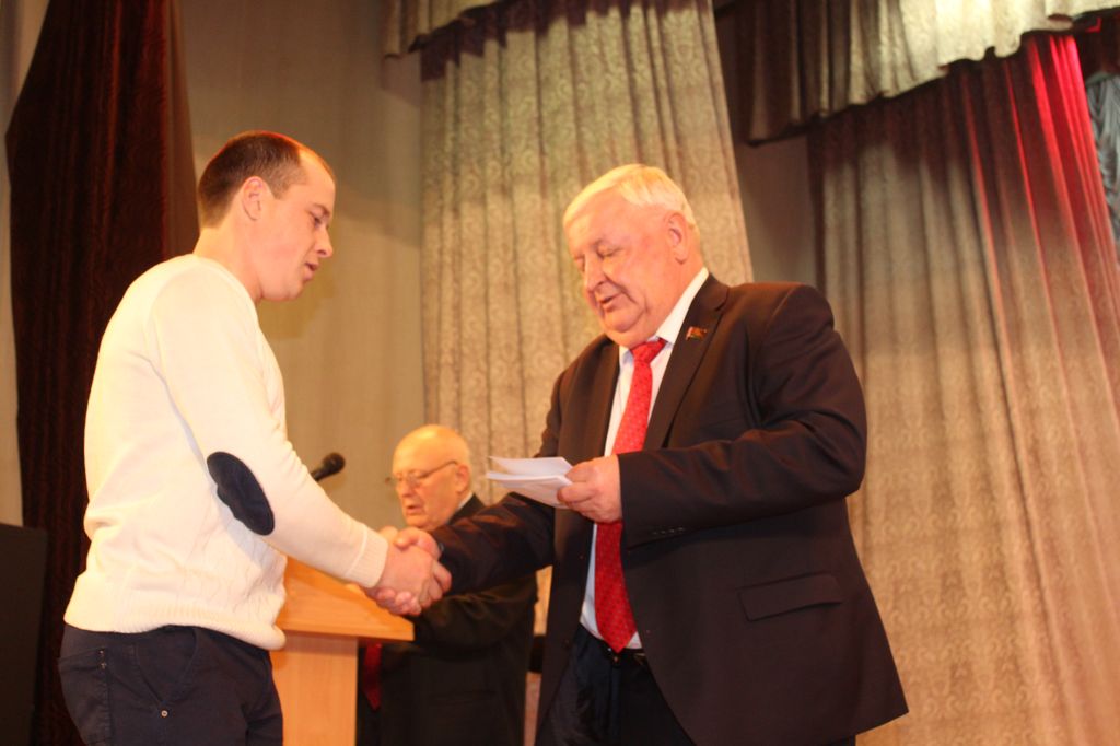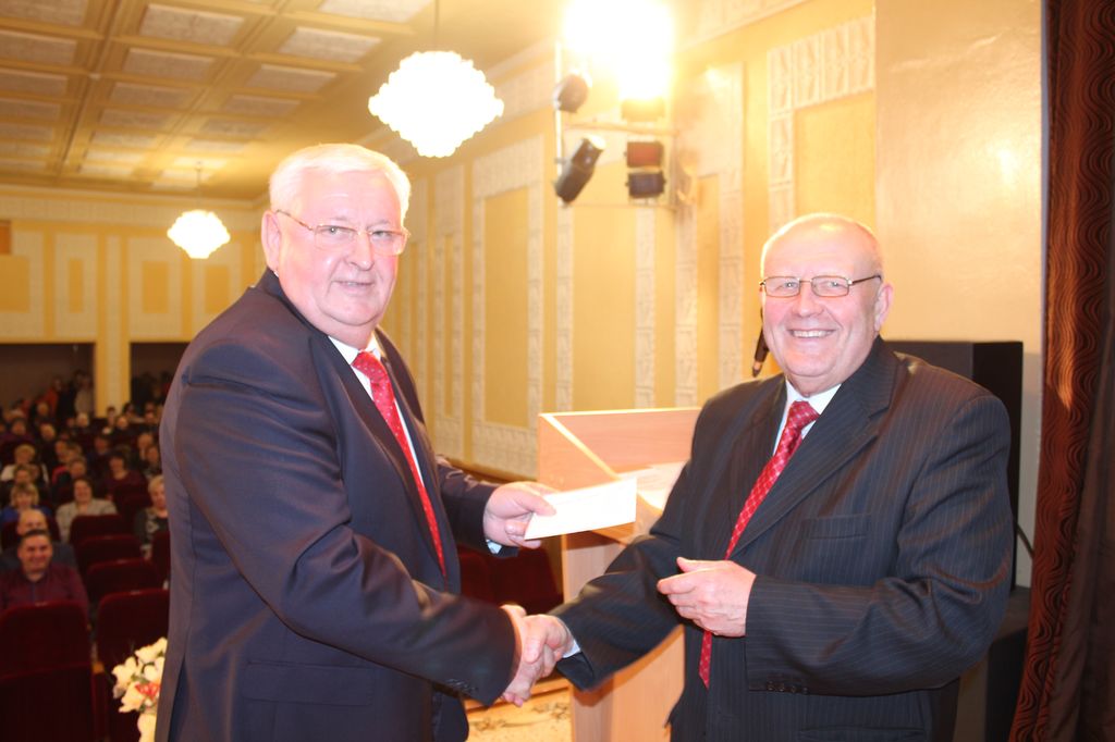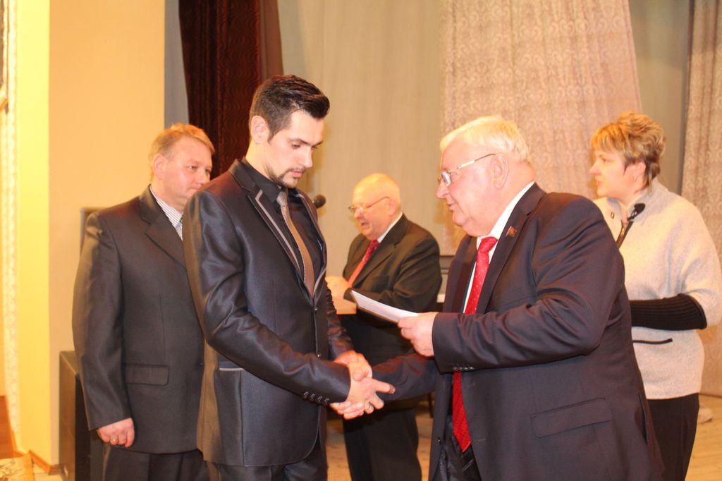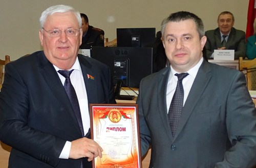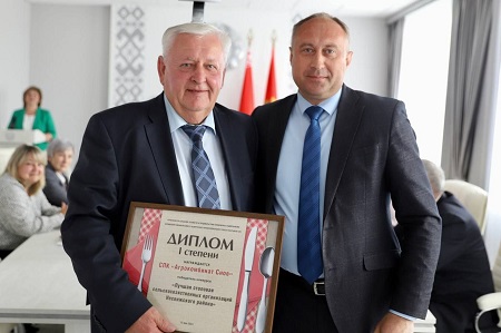 На фото: Председатель Несвижского райисполкома Иван Иванович Крупко вручает диплом за первое место члену Совета Республики Национального собрания Республики Беларусь , председателю СПК «Агрокомбинат Снов» Николаю Вячеславовичу Радоману.