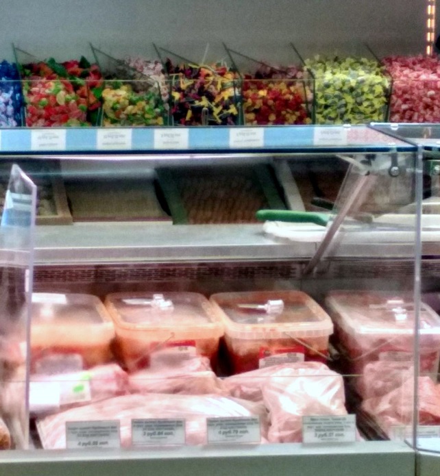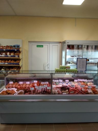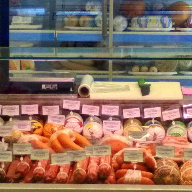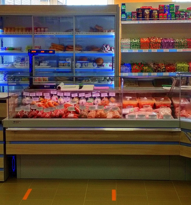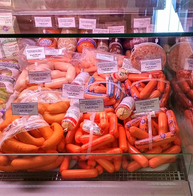 Выкладка мясной продукции в витринах фирменного магазина.