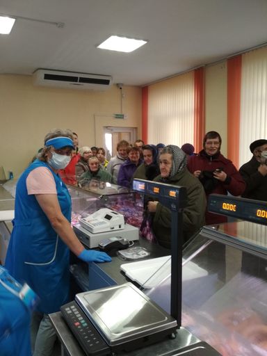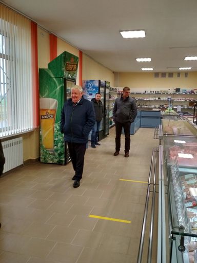 3 фото: Член Совета Республики Национального собрания Республики Беларусь, председатель правления СПК «Агрокомбинат Снов» Радоман Н.В. общается с первыми посетителями фирменного магазина.