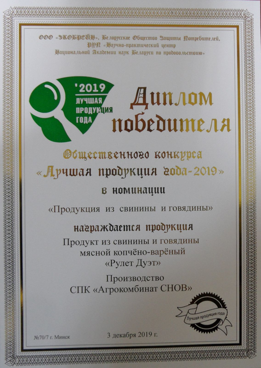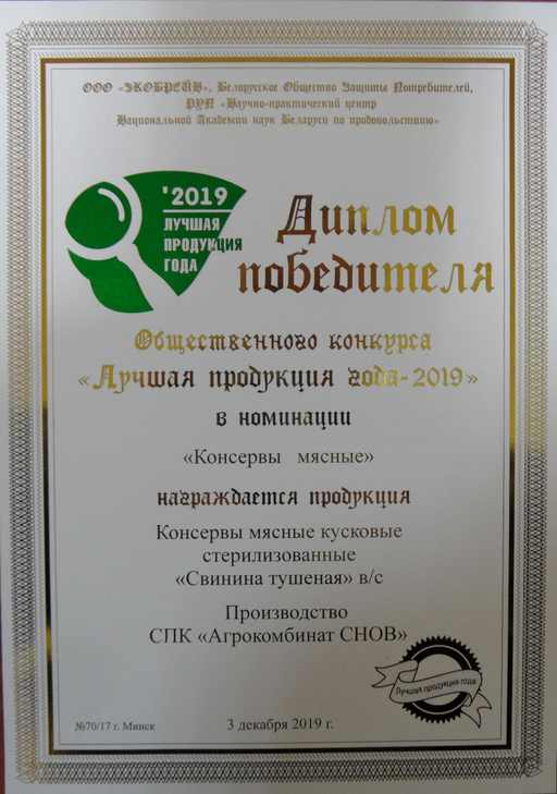 СПК "Агрокомбинат Снов" принял участие в республиканском общественном конкурсе "Лучшая продукция года-2019". По результатам конкурса дипломами победителя награждена продукция: Изделие колбасное салями сыровяленое мясное Колбаски "Рижские" в/с, продукт из свинины и говядины мясной копчено-вареный "Рулет Дуэт", Консервы мясные кусковые стерилизованные "Свинина тушеная" в/с.